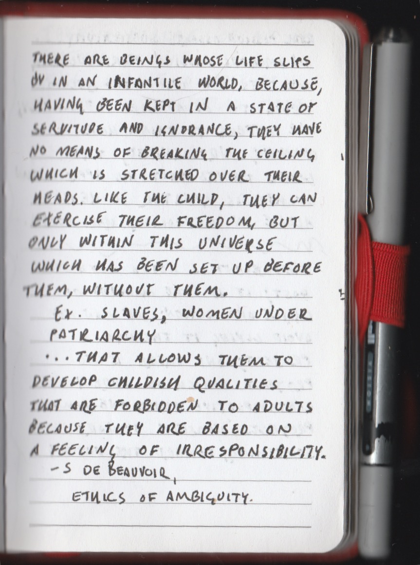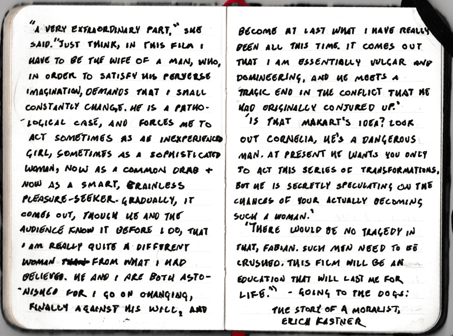 I have a long-cherished habit I've always kept of copying inspiring or intriguing passages out of books (this one, left, recently copied from Simone De Beauvoir's 'Ethics of Ambiguity'). This habit formed the basis for the quotation-heavy script for 'They Read By Night!'--that notebook is filled with passages from Marquis De Sade, Lord Byron, Battaile, Krzhizhanovsky--really actually looking back over it, it's staggering how many books I read in 2014-15 when I was preparing to make that film---was it that I had so much time, or maybe I felt an urgency, like there wouldn't be enough time to get it all in. It's marvellous to think how much time and energy one has and had at the age of 24. The script for 'Cornelia/Fabian' was also written this way, copied from an old German book that I'd read several years back, and rediscovered while flipping through the pages of my old Toyzanne notebook (with the showgirls).