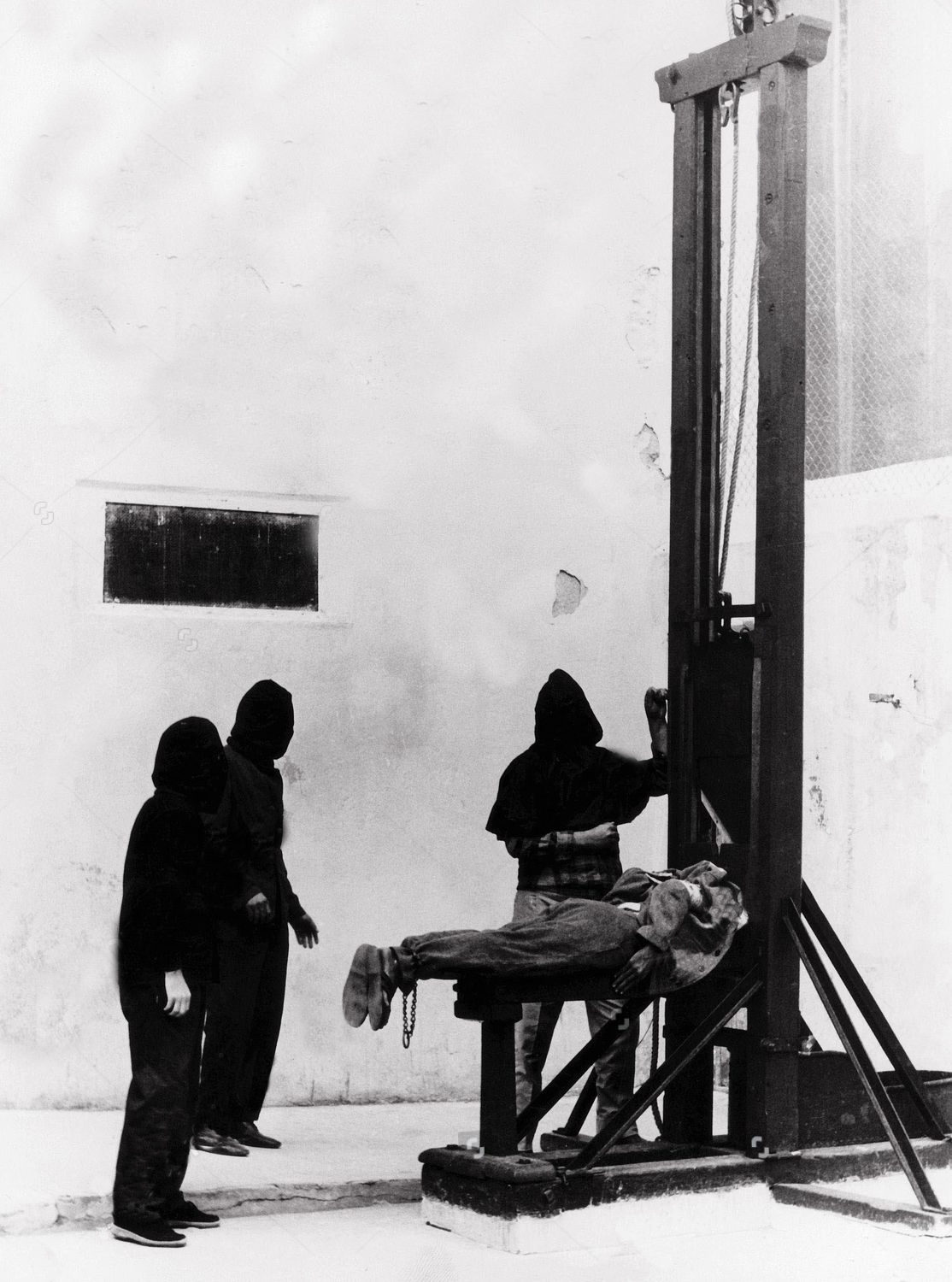 The book really did have 1001 entries, and in addition to the sort of canonical Hollywood fare you might expect, it was replete with descriptions of foreign, obscure, and even avant-garde films that had never even entered my imagination before. Even more incredible were the stills, full-color (when they were color films anyway) representing about a third of the movies in the book. Sometimes just seeing the still and knowing the image existed meant more than the meaning of whatever movie it was. Often when I'd see a film that I was aware of only through the still in the book, the full experience might fail to capture the feeling of mystery the still filled me with. Or I'd see a film and have no idea where it was in the experience of watching it the image from the book occured. A memorable instance of this was in the entry for Gillo Pontecorvo's 1965 influential classic of lefty guerilla cinema, 'The Battle of Algiers'. The entry contained, in extra small scale, this following still, representing the scene early in the film where the lead character, Ali La Pointe, is radicalized at the moment of viewing from his prison cell the execution of an Algerian comrade by guillotine: