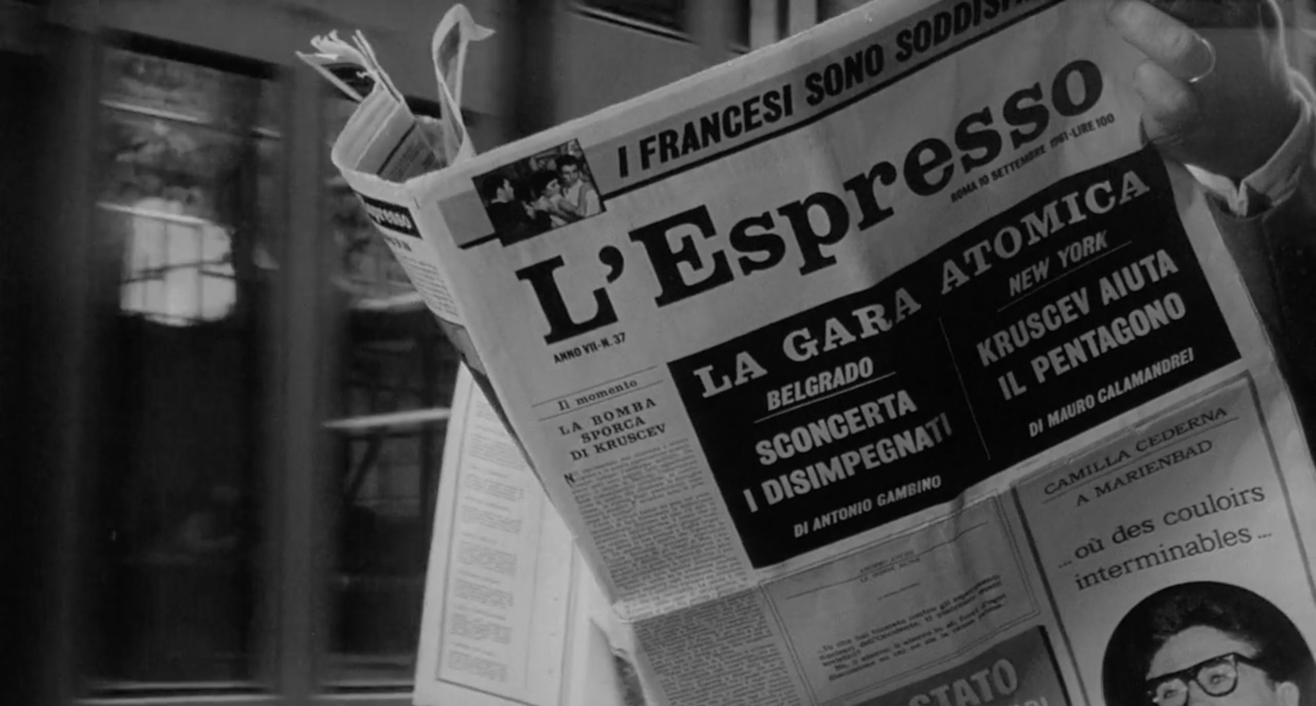 L'Eclisse contains a lot in a deceptively minimal package. Alain Delon plays a cocky stock trader, indifferent to the ebb and flow of dollar value in the marketplace, interested mainly in the thrill of the game--there's a lack of meaning apparent in the reality of economics at that level; that is, it's apparent to him, but to a character like Vittoria's Mother, who dabbles in the market via Piero as her broker, and is an older person unacquainted with the new reality; a crash like that has a much more serious emotional and distressing impact. Another character, an old, experienced stock trader has a more wistful reaction, retreating to a nearby bar to draw flowers on a napkin, as Vittoria watches at a distance, trying to understand. Vittoria and Piero, both beautiful attempt a love affair--it provides them with some pleasure but little passion. The movie star leads disappear from the film altogether during the apocalyptic last seven minutes. Using very little but the small detail of an allusive newspaper headline and the musical tension of Giovanni Fusco's score, the dread of imminent nuclear doom is made visceral, drawing a bold underline beneath the text of the entire film proceeding.