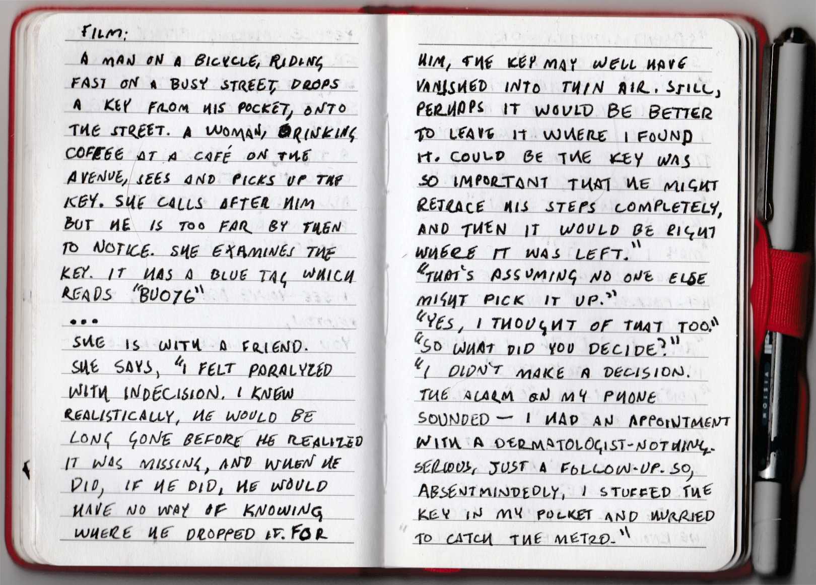 Most of my films start out handwritten--usually as a note in a notebook that expands to a snippet of dialogue or eventually a fleshed-out scenario. For larger projects, I tend to keep dedicated notebooks for each film, as well as a series of notebooks for smaller ideas--at any given moment I'm carrying about 3 on me. When I choose a particular notebook for a given project, I try to match certain elements of the film's conception to the notebooks' design; for instance, the notebook I wrote 'They Read By Night!' in was shiny silver, like the walls of the 60s Warhol Factory; conversely, 'THE SHOPLiFTERS' was written in a small red moleskin, chosen for its' resemblance to Mao Tse-Tung's Little Red Book: