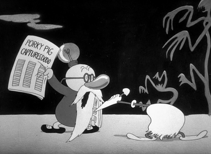 In the end of the Bob Clampett cartoon, Porky Pig disguises himself as a newspaper seller, hocking the headline that the last Dodo had been caught at last. The Dodo, the headline holding obvious interest to him, stops to read it, and Porky hits him with a mallet, casts off his disguise and catches the Dodo by his long silly goose-neck. He jumps up and down, clicking his heels with glee- "Oh Boy, I D-d-did it, I caught the Last of the D-d-d-odos!", to which our dear Dodo replies, "That's right, I'm really the last of the Dodos - Ain't I, Fellas?", and scores of Dodos appear from the shadows to surround and mock Porky!